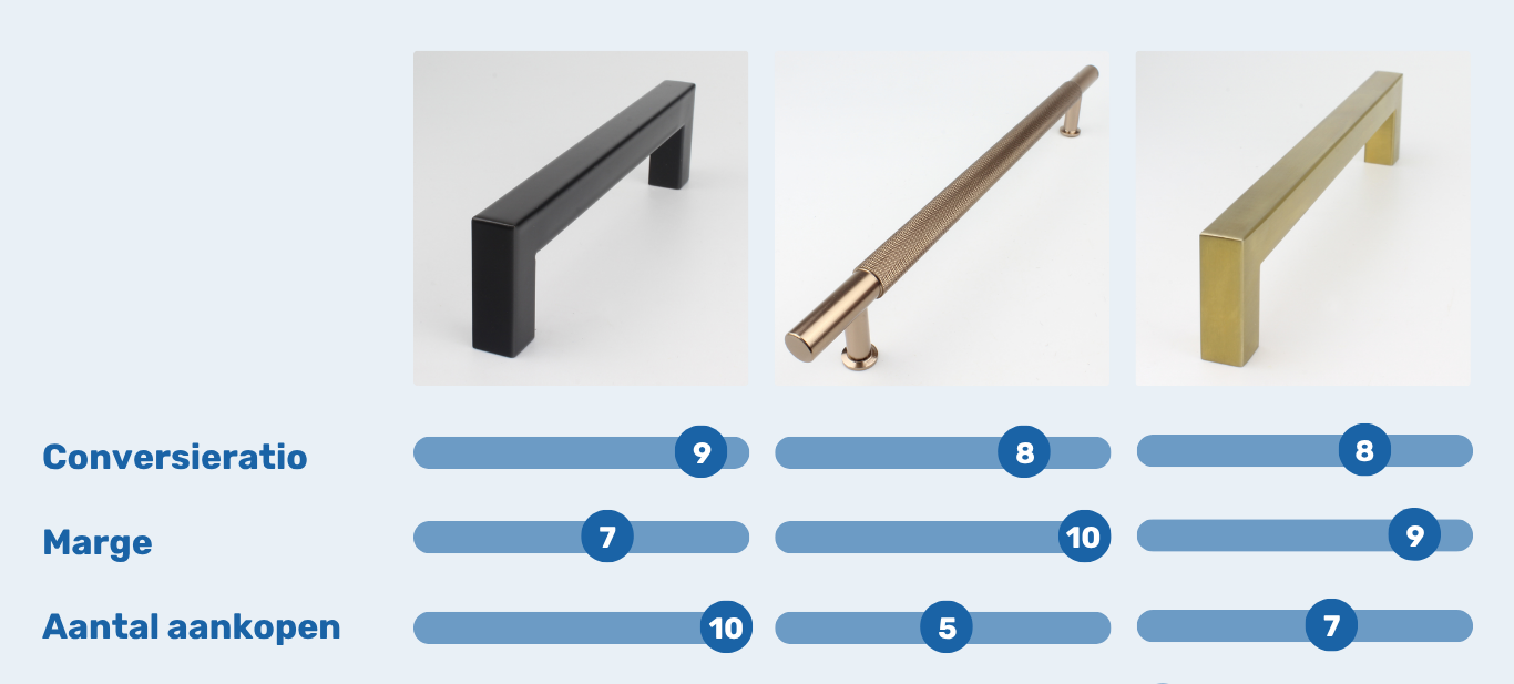 Door GA4-data te gebruiken over een recente tijdsperiode (bijv. afgelopen 30 dagen) krijgen ook nieuwe of seizoensgebonden producten een eerlijke kans. Zo staan er momenteel opvallend veel bronsgekleurde deurgrepen op de eerste pagina, omdat die nu populair zijn.